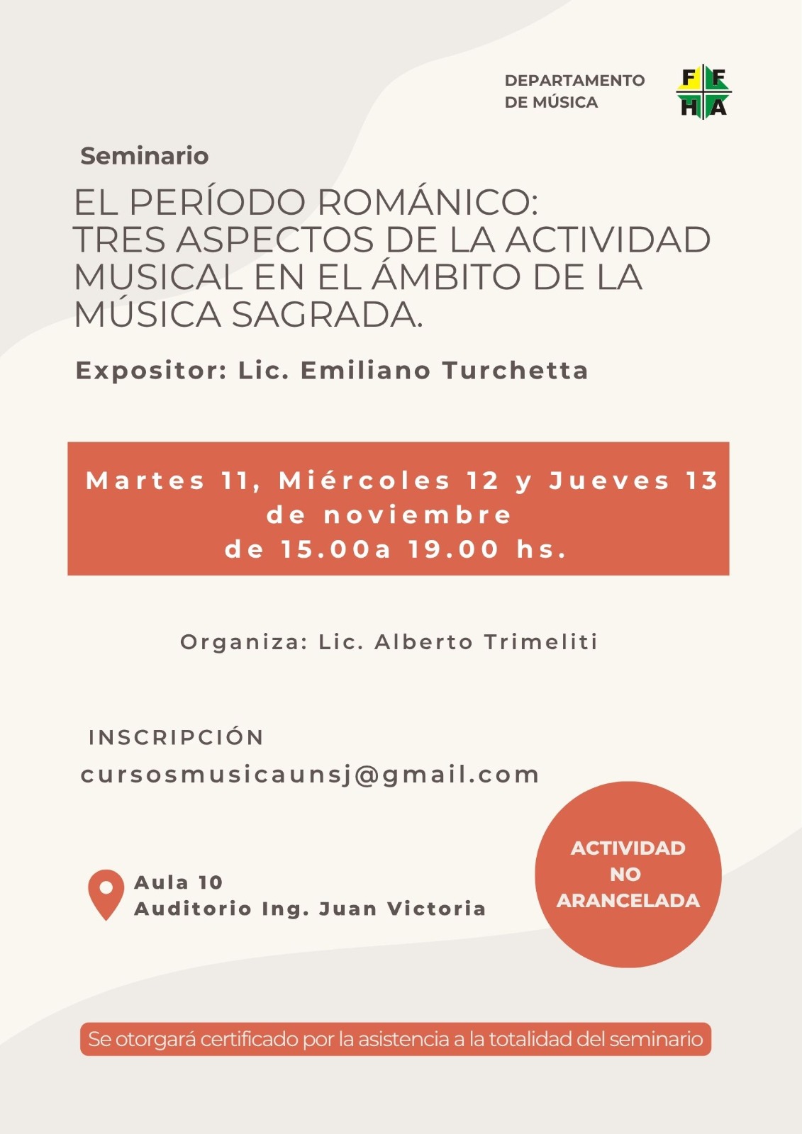Desde el Departamento de Música de la Facultad de Filosofía, Humanidades y Artes de la Universidad Nacional de San Juan, se dictará el Seminario: “El Período Románico: tres aspectos de la actividad musical en el ámbito de la Música Sagrada” a cargo del Lic. Emiliano Turchetta, quien es profesor titular de la Cátedra de Historia de la Música Argentina (UNA-DAMUS) “Carlos López Buchardo” y profesor titular de la Cátedra Seminario de Apreciación Musical- Seminario Mayor “San José” de la Plata.