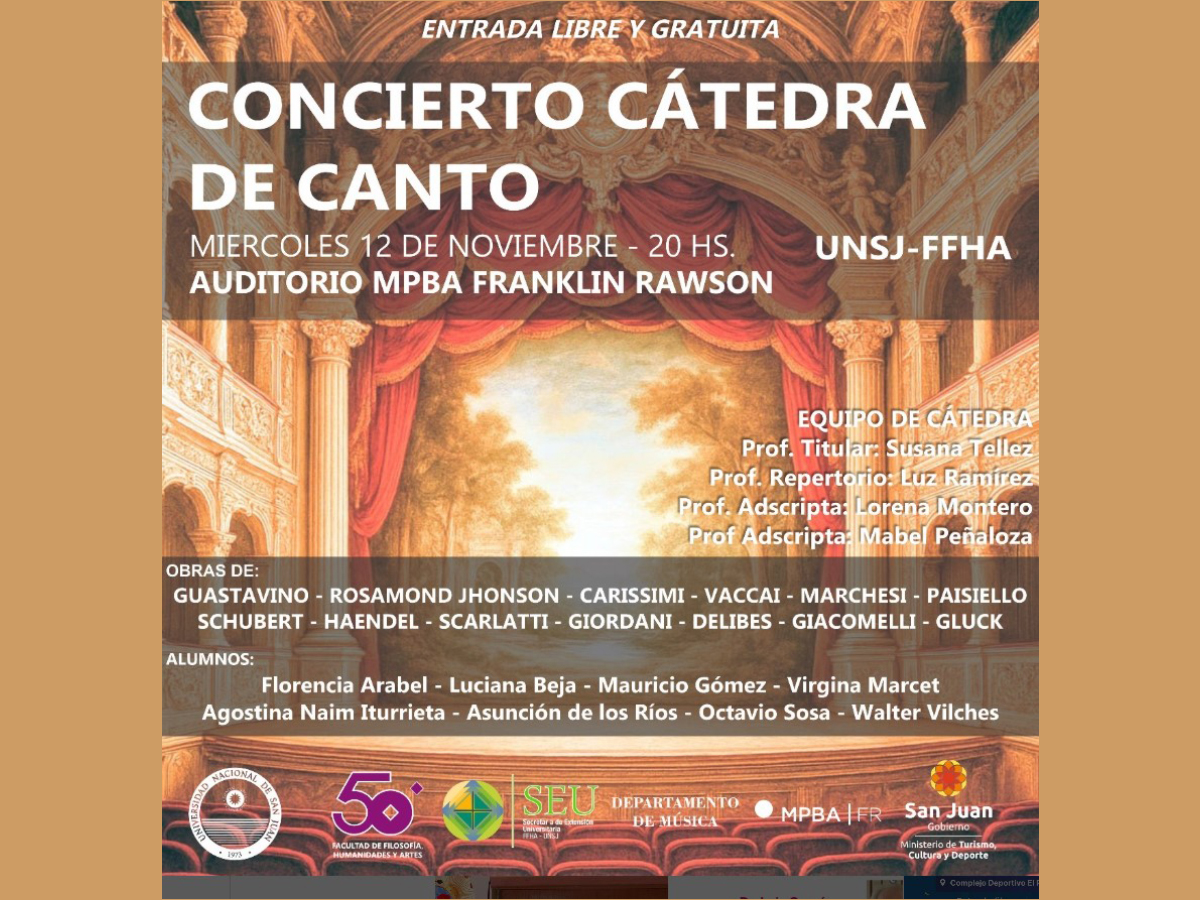 El Departamento de Música de la Facultad de Filosofía, Humanidades y Artes (FFHA) de la Universidad Nacional de San Juan (UNSJ) realizará un Concierto de la Cátedra de Canto, el miércoles 12 de noviembre a las 20 en el Auditorio del Museo Provincial de Bellas Artes Franklin Rawson (MPBA), con entrada libre y gratuita.