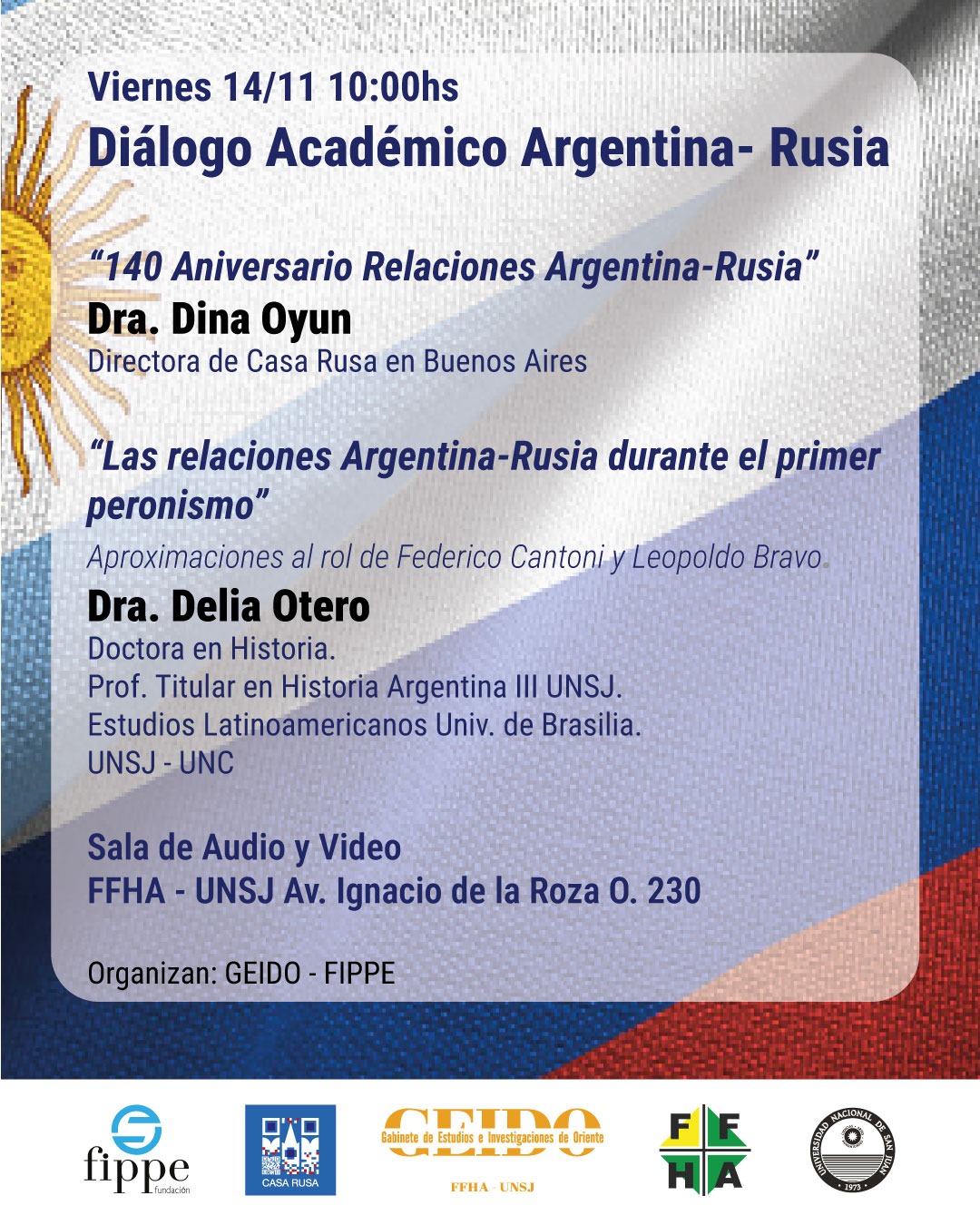 El Gabinete de Estudios e Investigaciones de Oriente (GEIDO) de la Facultad de Filosofía, Humanidades y Artes (FFHA) de la Universidad Nacional de San Juan (UNSJ), la Fundación Ideas Para Promover Equidad (FIPPE) y la Casa Rusa realizarán una actividad denominada Diálogo Académico Argentina- Rusia, el viernes 14 de noviembre a las 10, en la Sala de Audio y Video de FFHA-UNSJ, ubicada en Av. Ignacio de la Roza 230-oeste.
