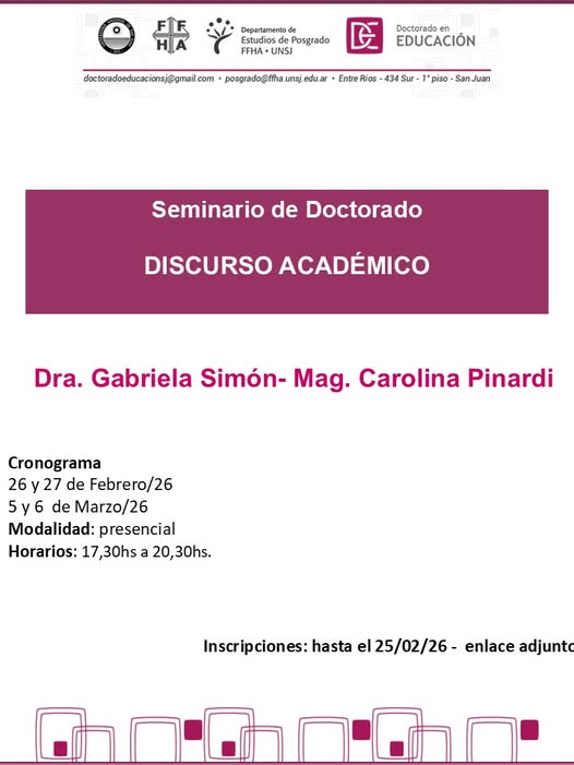 En el marco del Doctorado en Educación que se dicta en la Facultad de Filosofía, Humanidades y Artes de la Universidad Nacional de San Juan se realizará un Seminario sobre Discurso Académico.