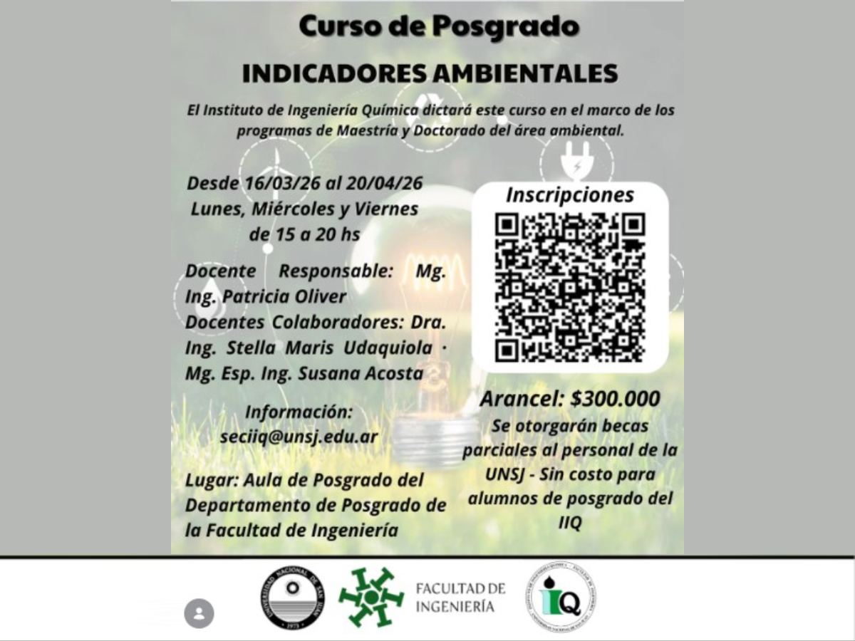 El Instituto de Ingeniería Química de la Facultad de Ingeniería de la Universidad Nacional de San Juan dictará el Curso de Posgrado: Indicadores Ambientales, desde del 16 de marzo al 20 de abril, en el marco de los programas: Doctorado de Ingeniería Química, Mención Procesos Limpios, Maestría en Tecnologías Ambientales y Maestría en Gestión de la Información Ambiental para el Desarrollo Sustentable.