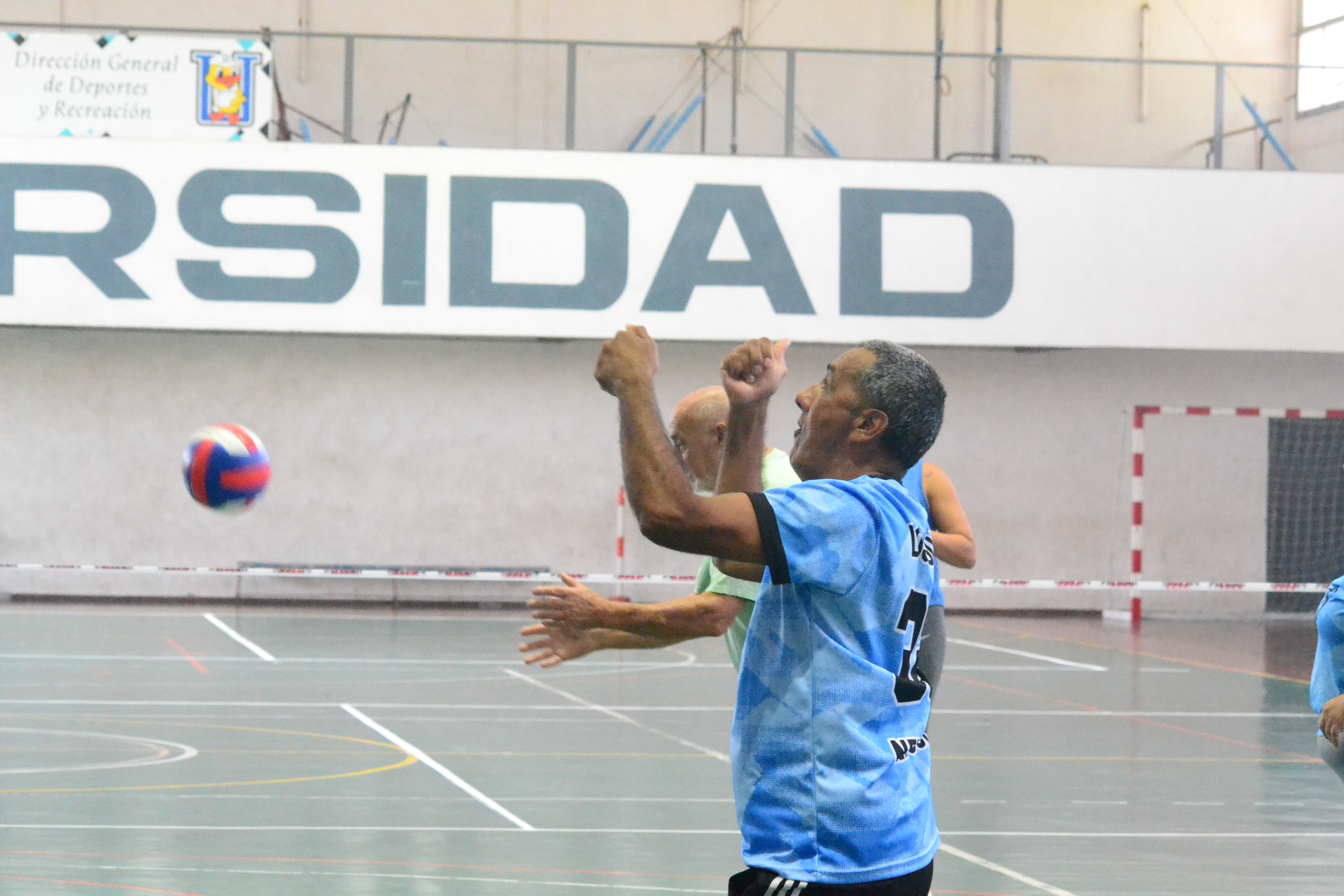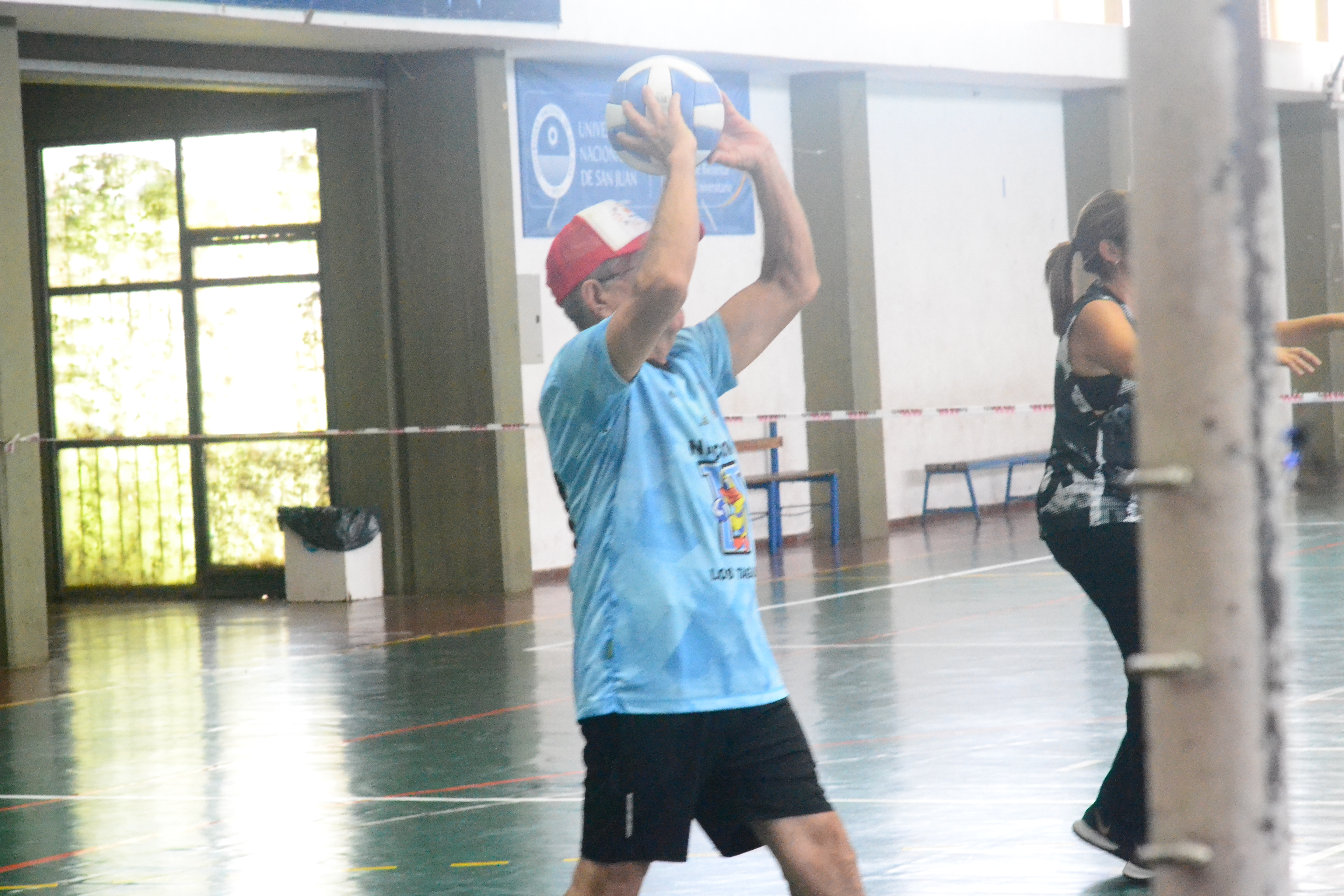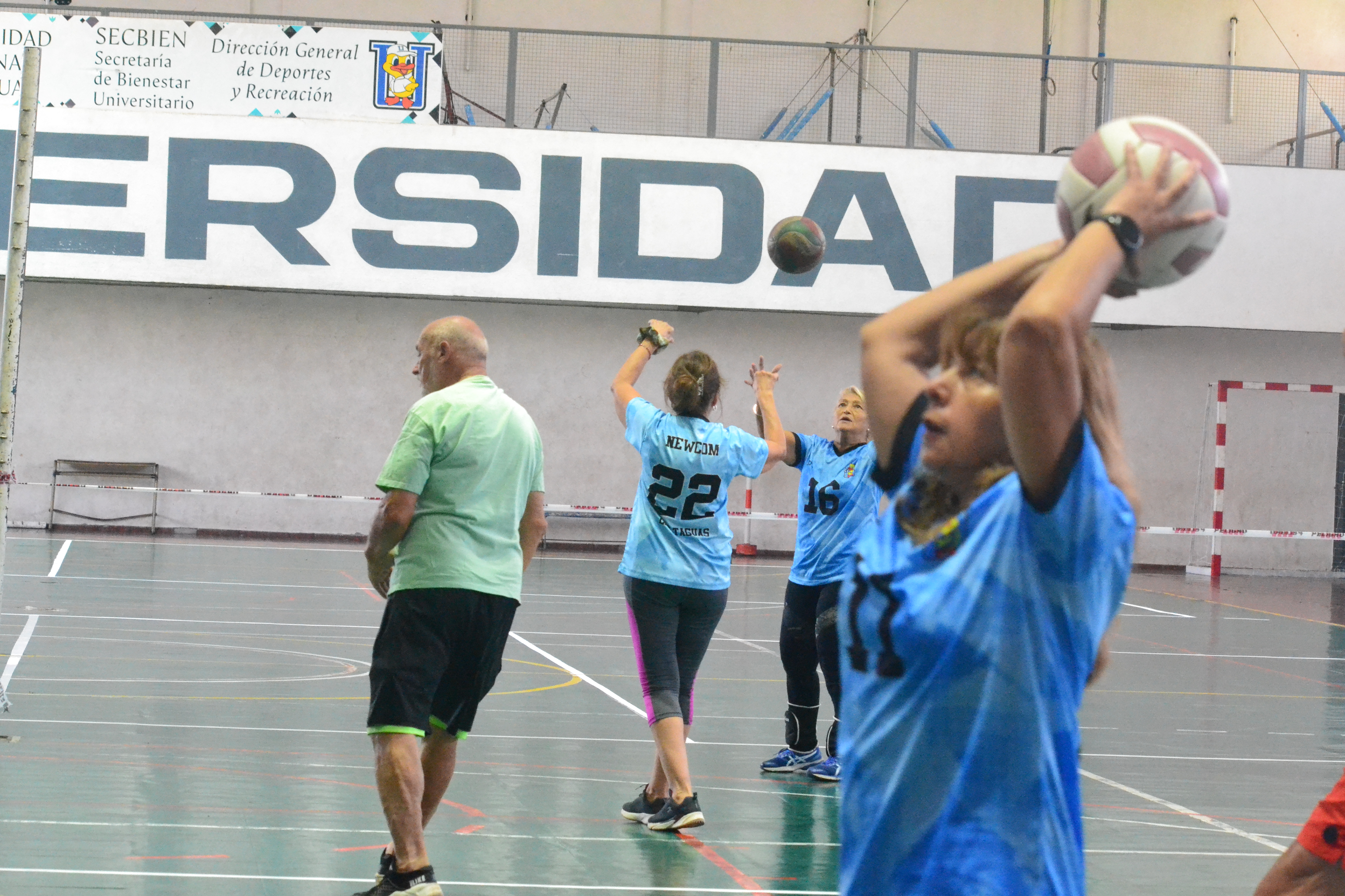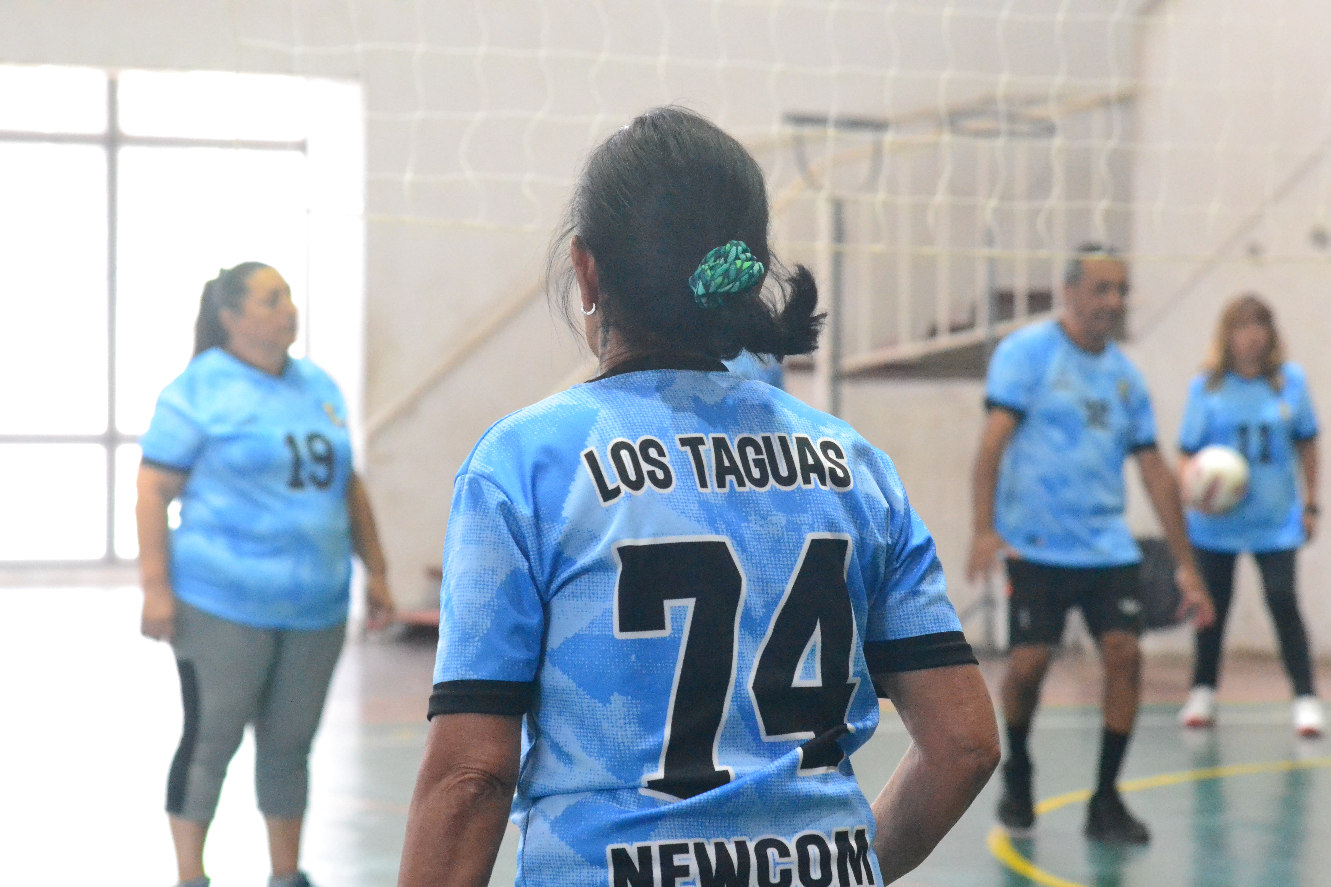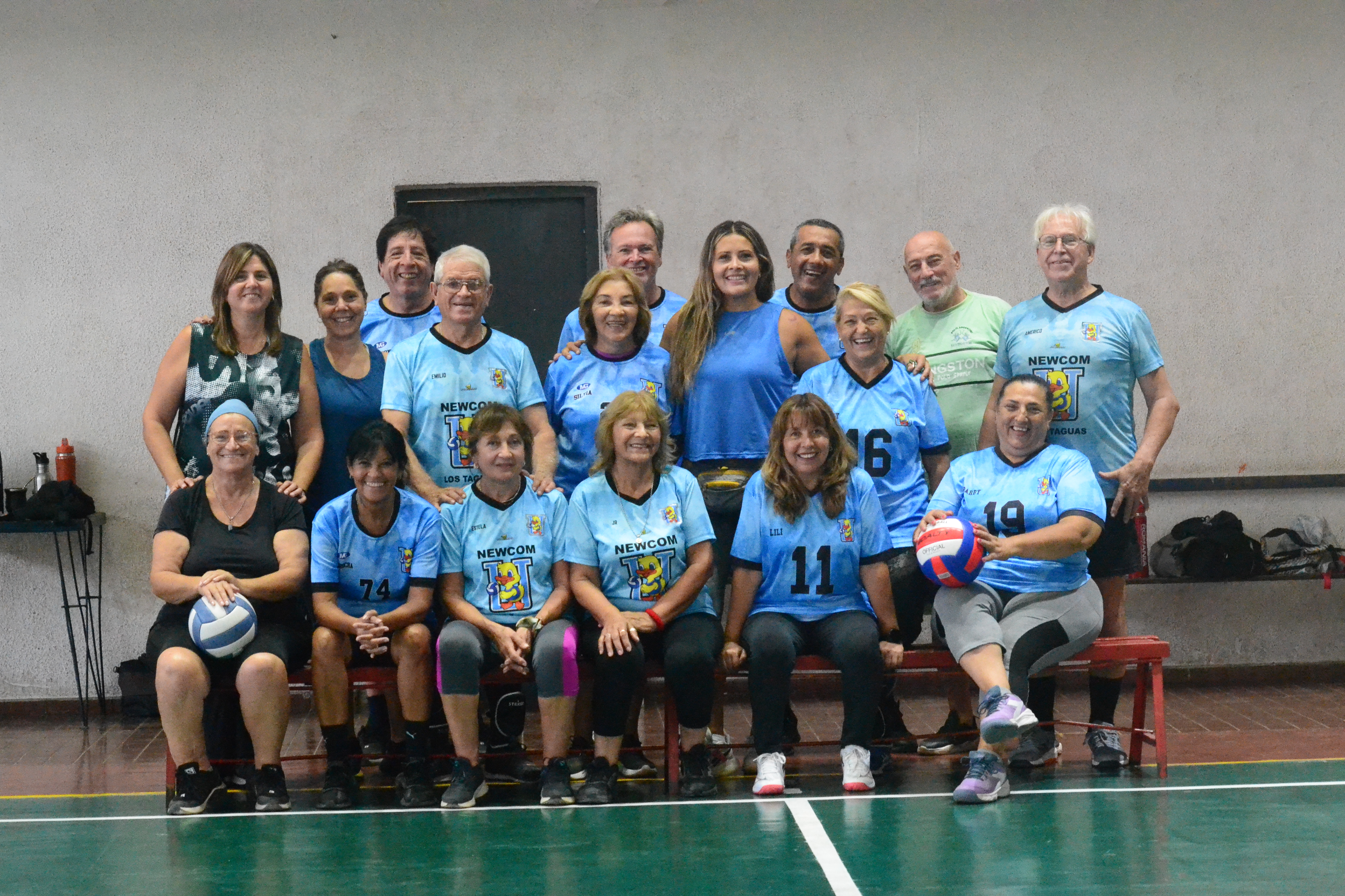Los Taguas es el nombre de los equipos de Newcom, una variante del vóleibol adaptada principalmente para adultos mayores. En la UNSJ hay tres equipos de distintas edades a partir de los 50 años. Los partidos empiezan a las nueve de la mañana.